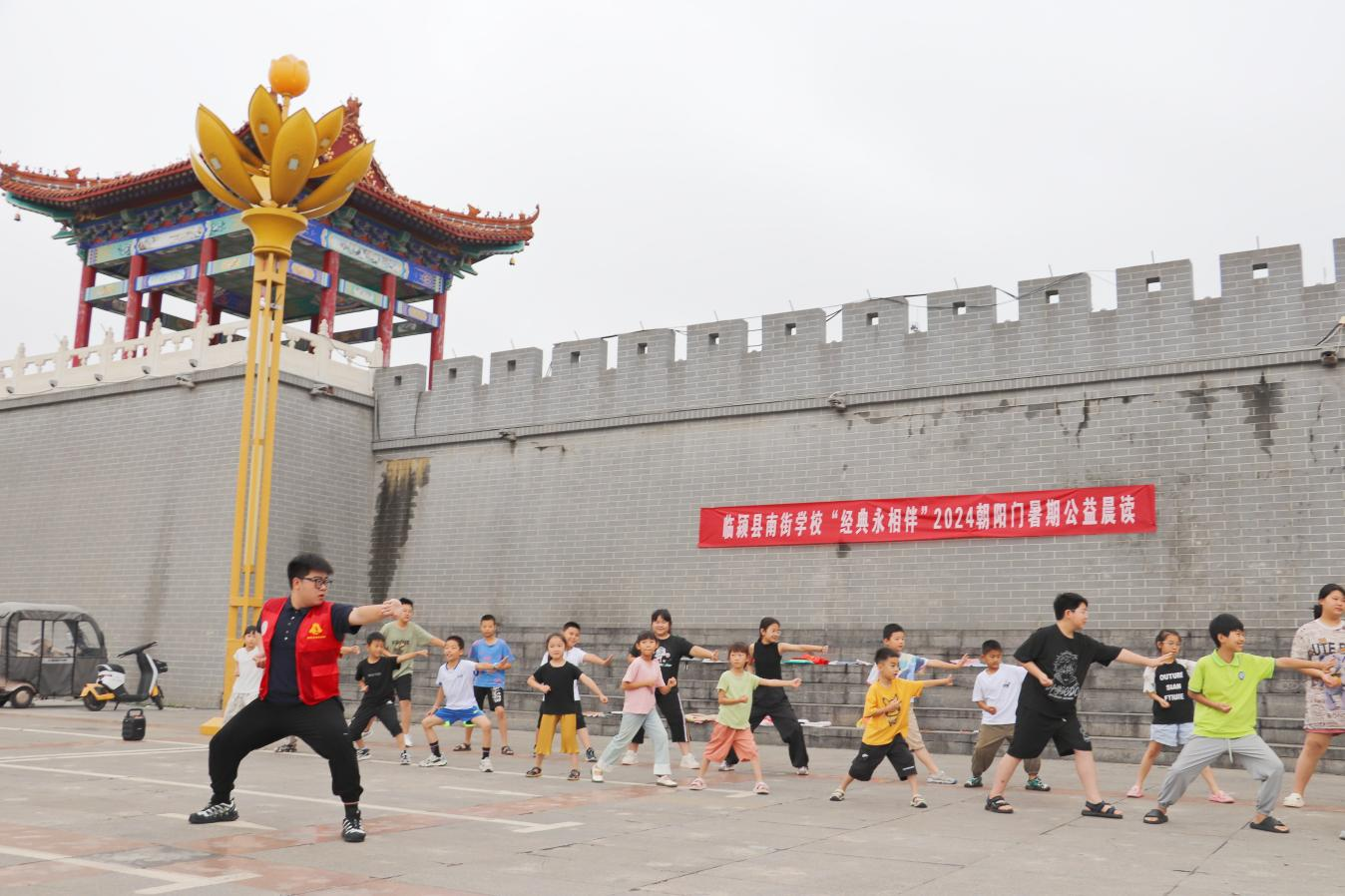 “沖拳!一,哈!二,哈!……”清晨,在漯河市臨潁縣南街村朝陽門廣場激蕩著響亮的口號聲,這聲音整齊劃一、鏗鏘有力,伴隨著氣勢十足的聲音,只見孩子們做出馬步、穿掌、沖拳、踢腿等經典的武術招式,動作有力,虎虎生風。