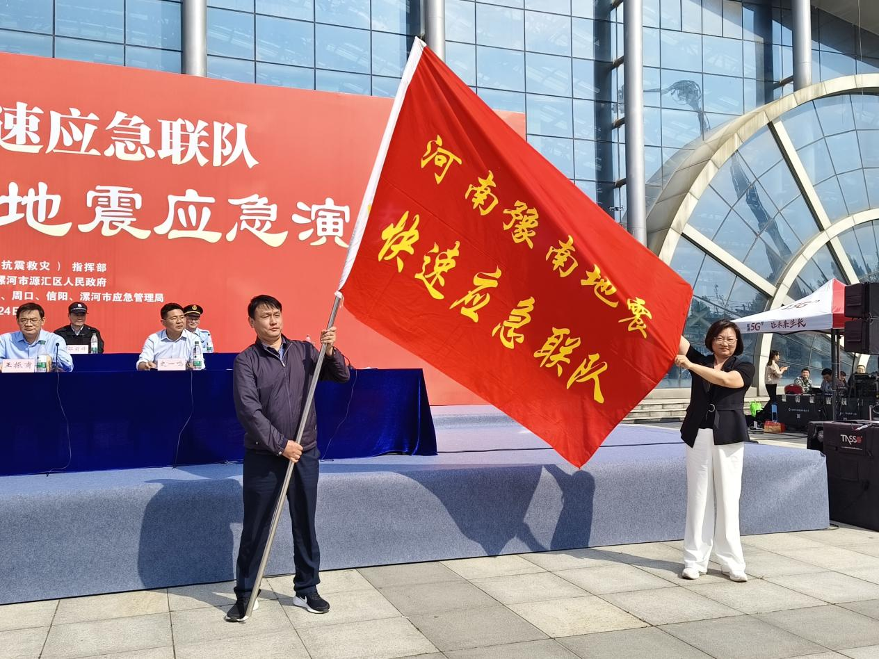 演練結(jié)束,漯河市防震減災(zāi)中心主任閆秋霞與周口市應(yīng)急保障中心主任袁志勇進(jìn)行了豫南地震快速應(yīng)急聯(lián)隊旗幟交接。
