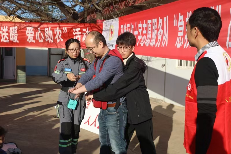 首先進行“急救地攤”應(yīng)急救護演練,區(qū)紅十字志愿者們攜帶急救設(shè)備,現(xiàn)場演示急救技能,通過“大手拉小手”的方式,家長和孩子們一起練習急救自救互救技能。