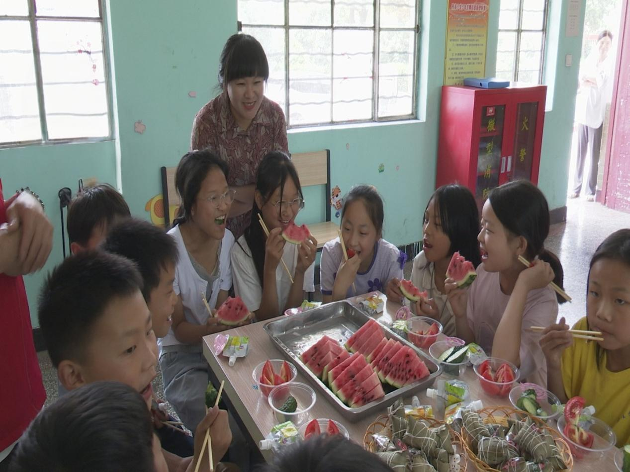 在三家店鎮(zhèn)高宗寨村兒童之家,鎮(zhèn)村干部們一早便忙活開來。他們精心準(zhǔn)備了粽子、果凍,將鎮(zhèn)內(nèi)特色農(nóng)產(chǎn)品西紅柿、黃瓜、西瓜洗凈切片,撒上白糖,制成飽含愛意的美食。活動現(xiàn)場,孩子們圍坐在一起,伴隨著稚嫩的童聲合唱《小星星》,品嘗著酸甜可口的西紅柿、清爽多汁的果蔬拼盤和軟糯香甜的粽子,歡聲笑語此起彼伏。"太好吃啦!紅紅的西紅柿、圓圓的大西瓜、脆脆的黃瓜,還有甜甜的粽子,比我以前吃過的都好吃!我太喜歡了",高宗寨小學(xué)學(xué)生宋夢凡開心地分享著感受。鎮(zhèn)村干部們一邊與孩子們品嘗美食,一邊親切詢問學(xué)習(xí)生活情況,用實(shí)際行動傳遞溫暖關(guān)懷。