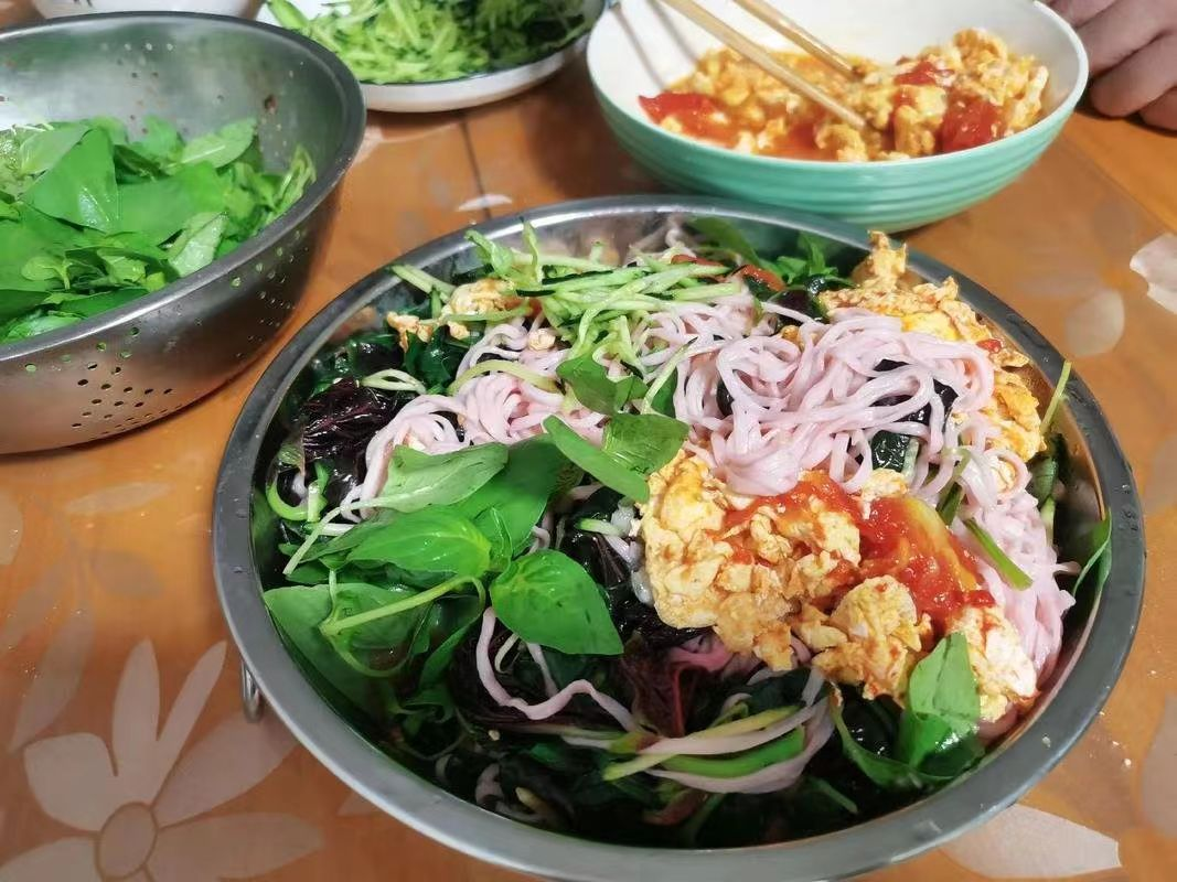 滾水翻涌如澧河急流。手搟面抖散入鍋,寬若韭葉的面條在漩渦中舒展腰肢。待面將熟,一把紫紅葉脈的玉米菜躍入鍋中,清波霎時染作胭脂色——這是漯河人鐘情的點睛之筆,綠葉紅湯里藏著土地的血脈。
