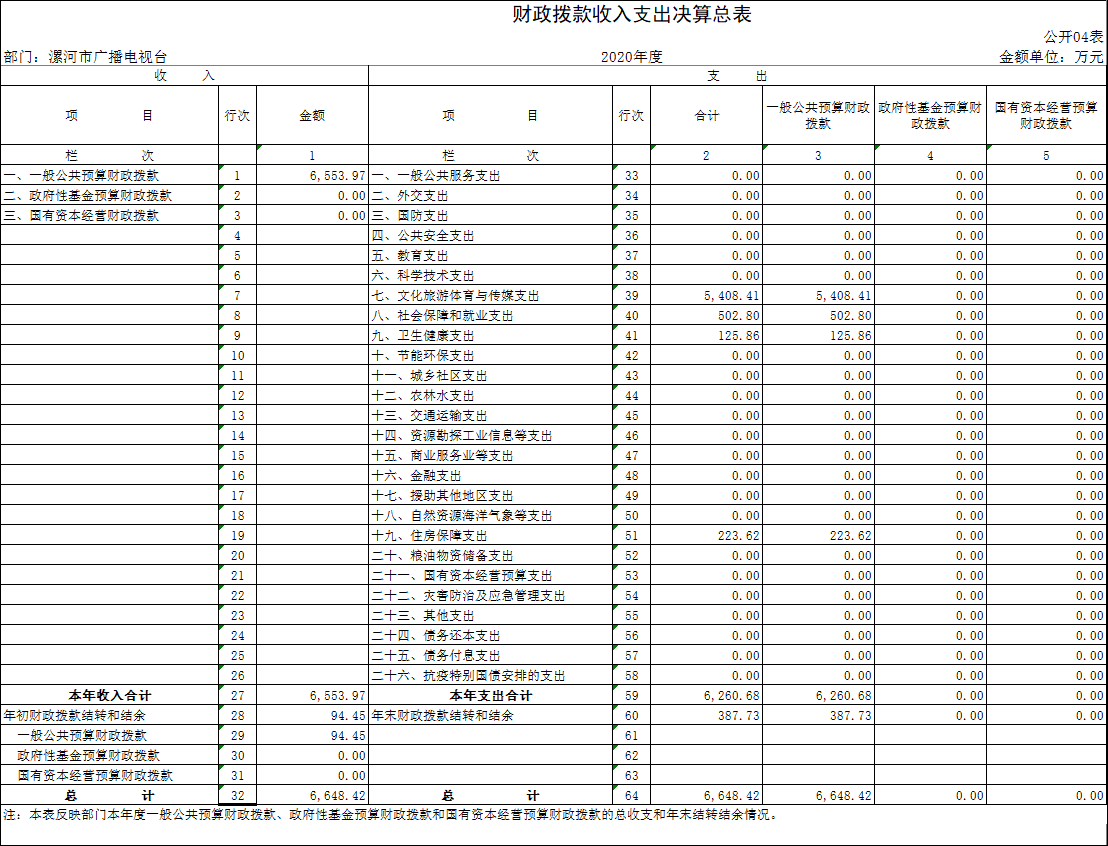 2020年度財政撥款收、支總計均為6648.42萬元。與上年度相比,財政撥款收、支總計各減少997.73萬元,下降13.05%。主要原因是廣告收入下降;機構改革,人員減少。