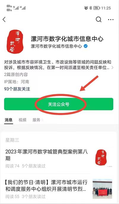 在微信搜索欄中搜索“漯河市數(shù)字化城市信息中心”或通過掃描二維碼關注公眾號。關注微信公眾號后,首先打開手機GPS定位功能。