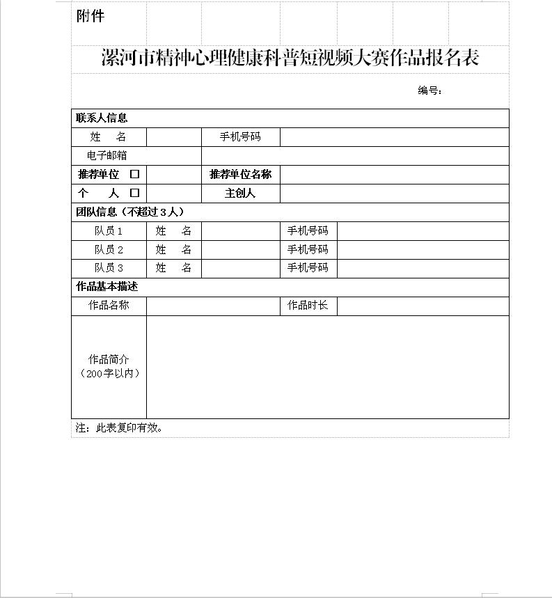 附件:漯河市精神心理健康科普短視頻大賽作品報(bào)名表