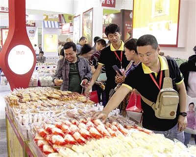 在場(chǎng)館內(nèi)的A區(qū)入口處,一個(gè)帶有濃濃中國(guó)風(fēng)的展位吸引了記者的目光。隨著一個(gè)個(gè)火紅的繡球望去,原來(lái)是“金老大老月餅”的展館。記者一進(jìn)入展館好像時(shí)光就拉回到中秋佳節(jié)。展館正中央,有一個(gè)直徑50厘米的大月餅,引來(lái)不少人圍觀。“這個(gè)月餅是我們這里最大的,可以根據(jù)顧客需要定制。想吃牛肉味的我們就做成牛肉味的,想吃五仁的就做成五仁的,只要顧客想得到,我們都可以做。”工作人員對(duì)記者介紹。