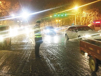 記者在多個路口看到,許多民警也在冒雪指揮交通。記者了解到,市區(qū)的輔警和騎警全員出動,且大部分從下午上崗到晚上7點,沒有休息過一分鐘。