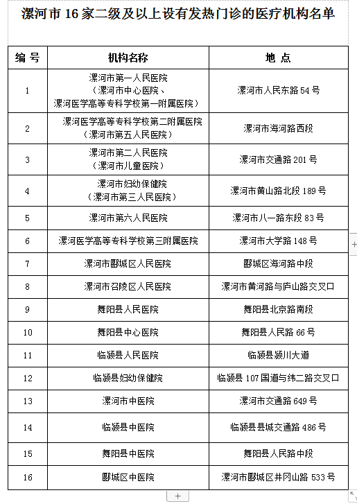 根據(jù)河南省衛(wèi)生健康委發(fā)布《關(guān)于印發(fā)河南省新型冠狀病毒感染的肺炎醫(yī)療救治定點(diǎn)醫(yī)院名單的通知》豫衛(wèi)醫(yī)函〔2020〕2號(hào)文件要求,全省公布了130所新型冠狀病毒感染的肺炎醫(yī)療救治定點(diǎn)醫(yī)院名單,漯河市共三家醫(yī)院,請(qǐng)廣大市民敬請(qǐng)關(guān)注并相互提醒,現(xiàn)公布如下:漯河市中心醫(yī)院(漯河市第一人民醫(yī)院)、臨穎縣人民醫(yī)院、舞陽縣人民醫(yī)院;漯河市傳染病醫(yī)院(救治準(zhǔn)備醫(yī)院)。