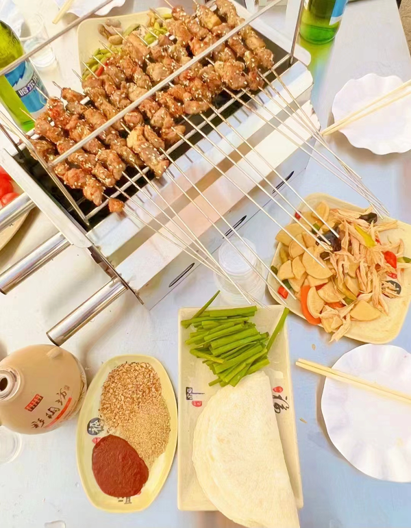 伴著夕陽的余暉,鼓風機在爐頭轟鳴,肉已提前腌過,猛火之上,油脂淋漓,廚師取毛刷蘸醬在肉面簡單一抹,油料肉汁灑在火上,橘色的火舌頭將那肉串舔上七八回,帶著猛烈的葷氣,油脂的香味瞬間四溢開來,將烤好的肉串取下,在蘸料中一滾,餅放在手上,串放在餅上,而后手攥餅將肉從簽子上擼下,將一段小蔥對折,蘸些秘制醬放在餅內(nèi),整個悶入口中,享受著滋滋冒油的烤串、碳水以及鮮蔬在口腔的對撞,咀嚼間豐腴醇厚滋味迸發(fā)在唇齒間,瞬間喚醒的味蕾把我們帶回鄉(xiāng)土田園的時光,奔赴一場久別的兒時重逢,撩撥起我們內(nèi)心最柔軟的情感,共繪一副人間煙火畫卷。(通訊員:楊麗麗 張付慶)