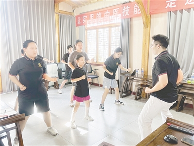 目前正值暑假,知育學(xué)堂內(nèi)的青少年中醫(yī)夏令營活動(dòng)正在進(jìn)行中。記者在夏令營的活動(dòng)教室看到,十幾個(gè)孩子跟著老師練習(xí)八段錦。參加夏令營的孩子們來自天津、河北、鄭州等。“我媽媽從河北開車把我送到這里,主要是為了培養(yǎng)我對(duì)中醫(yī)的興趣,讓我了解如何調(diào)理自己的身體。”今年12歲的陳榮告訴記者。