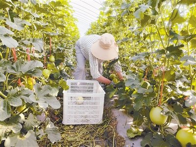 在甜瓜大棚,翠綠的甜瓜秧爬滿了架子,甜瓜個大體重、色澤誘人。“‘綠寶’甜瓜一上市就供不應求。這幾天我們增加了人手,加快采摘、裝車,爭取讓市民早一點兒嘗‘鮮’。”工人薛鳳蘭看著眼前掛滿棚架的“綠寶”甜瓜高興地說,“綠寶”甜瓜與普通甜瓜相比,糖度高、肉質細脆多汁、口感清甜爽口,且含有大量的維生素等。大棚內除了種植有“綠寶”甜瓜外,還有“星甜22”甜瓜、美都西瓜、櫻桃番茄等。