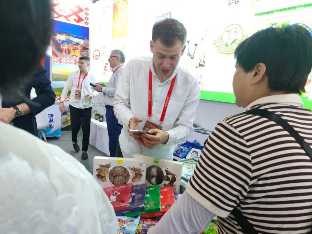 在白俄羅斯的展區(qū)前,記者通過中方的翻譯,在待等了一段不短的時(shí)間后,終于采訪了一直忙碌交流的、來自白俄羅斯莫吉廖夫州自由經(jīng)濟(jì)區(qū)比霍夫罐頭廠有限責(zé)任公司的代表維塔利先生。