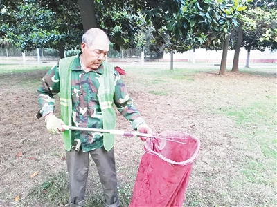 “已經(jīng)做園林工人3年了,這個撿樹葉的工具是我自己摸索出來的。”袁全水一邊拿著這個1米多長的鐵桿,一邊向記者介紹。