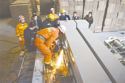 怎么辦?救援人員分為兩組,一組對(duì)機(jī)器進(jìn)行拆卸,一組利用撬杠等工具撬動(dòng)鋼卷軸。最終,被困女工被成功救出。