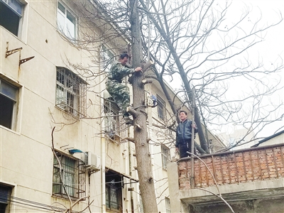 3月21日一大早,市城管局園林處派出的工人趕到了現(xiàn)場,在不破壞線纜的前提下,采用人工伐移的辦法,經(jīng)過一上午工作,兩棵枯樹被順利伐移。