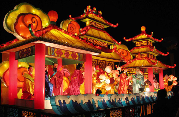 到了清代,花燈種類繁多,有形色俱佳的各種燈,其中有古樸典雅的宮燈,五彩繽紛的龍燈,結(jié)構(gòu)精巧、借風旋轉(zhuǎn)的走馬燈,綾綢扎制、栩栩如生的人物燈等。清代,雖然宮廷不再辦燈會,但是民間的燈會卻仍然壯觀。燈會的日期縮短為五