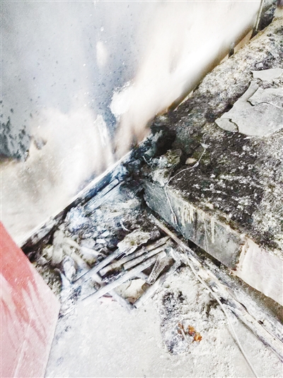 5月23日,接到消息后,記者立即來到金域藍灣小區(qū)失火居民家中,看到失火的臥室一片狼藉,屋里的家具和墻壁被熏得黑乎乎的,窗簾掉落在地上,兩塊窗戶玻璃也因高溫而炸裂。被燒焦的被子上,還有一根黑乎乎的手機充電線。