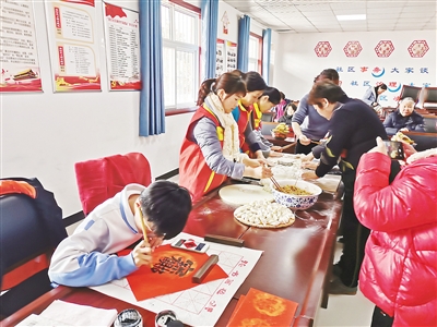 活動開始前,社區(qū)共建單位漯河市實驗中學的老師和學生們進行了寫春聯(lián)、送春聯(lián)活動,社區(qū)志愿者則在一旁包餃子。