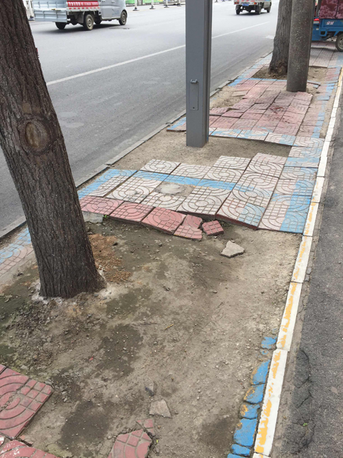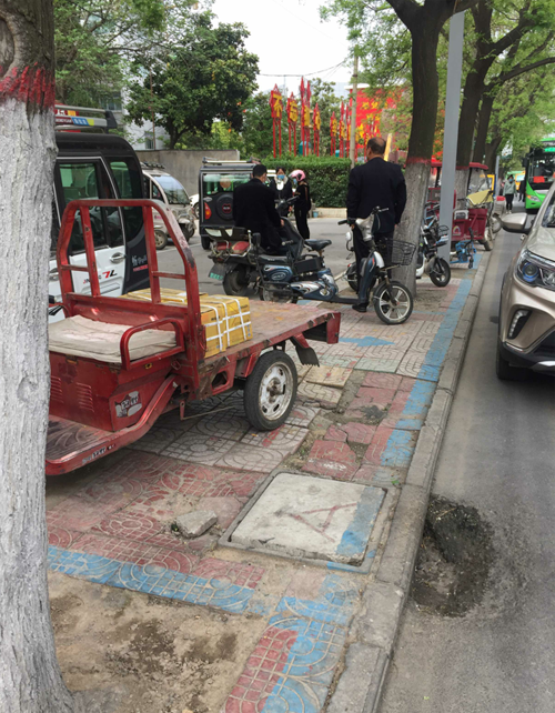 人民路涵洞以東至金山路段,行道樹間地磚破損、車輛亂停亂放。