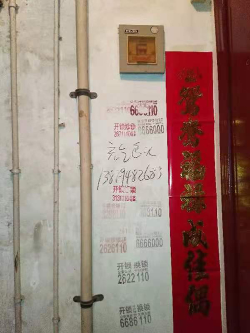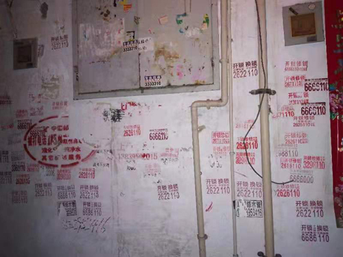 3515社區(qū)55號(hào)樓2單元樓道被寫滿小廣告。