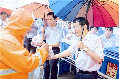 (記者 劉 丹 版式 付廣亞)市委書記蒿慧杰冒雨看望堅(jiān)守一線的環(huán)衛(wèi)工人,并送上免費(fèi)愛心早餐。