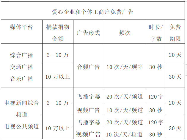 1、服務對象:在疫情防控期間,凡向我市防疫一線捐款捐物的企業(yè)、個體工商戶(包括本地和外地企業(yè)),均可享受免費廣告服務。