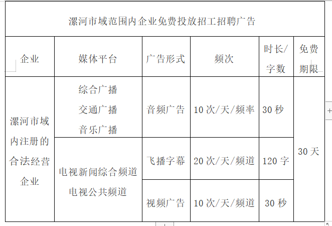 一、漯河市域范圍內企業(yè)免費投放招工招聘廣告