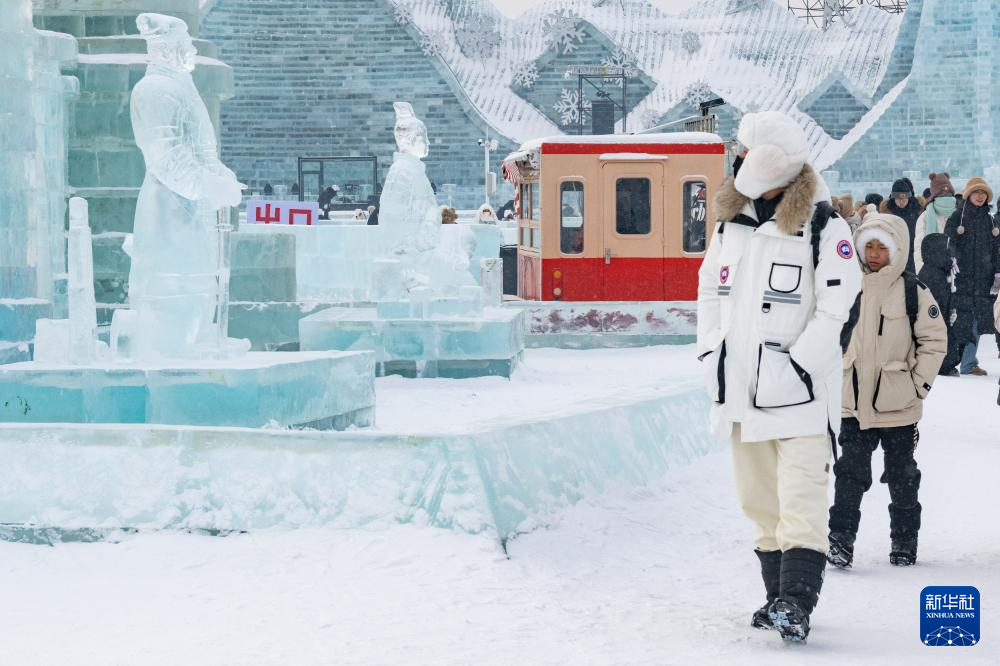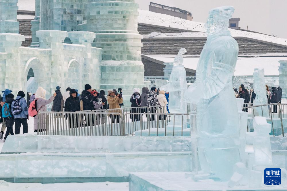 1月23日,在哈爾濱冰雪大世界園區(qū),游客在“冰馬俑”冰雕附近游玩。