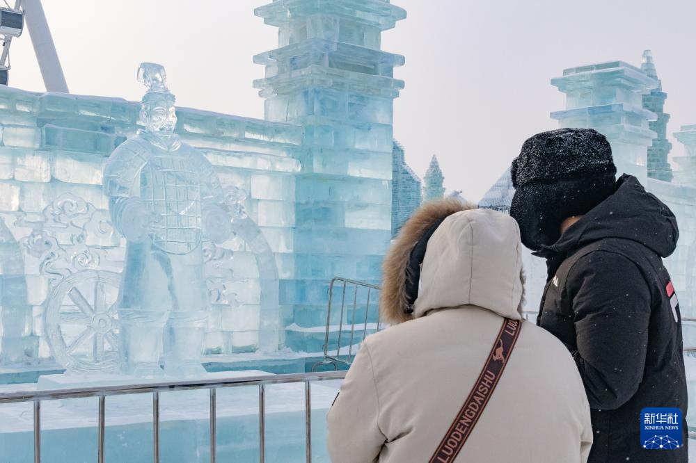 1月23日,在哈爾濱冰雪大世界園區(qū),游客在“冰馬俑”冰雕前游玩。