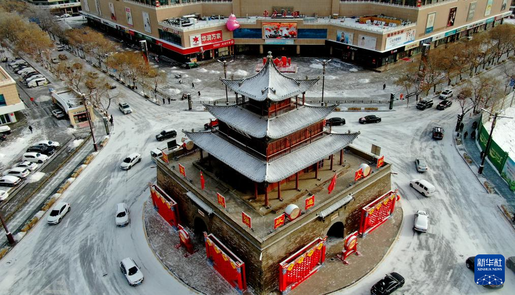 2月21日在甘肅省酒泉市拍攝的雪后鐘鼓樓(無(wú)人機(jī)照片)。