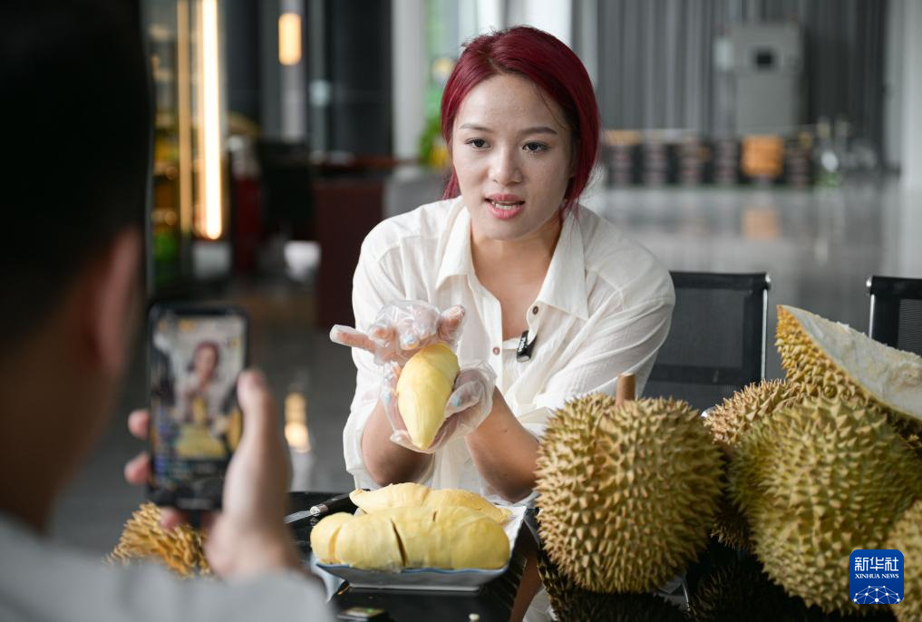 7月20日,在海南省三亞市優(yōu)旗大嘴鳥榴蓮園一號基地,網(wǎng)絡主播在視頻直播中介紹國產(chǎn)榴蓮。