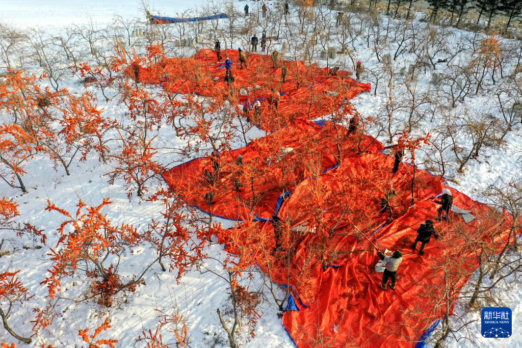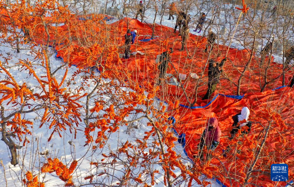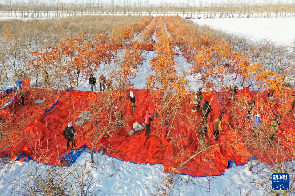 12月16日,黑龍江北大荒農(nóng)業(yè)股份有限公司友誼分公司的種植戶在采收沙棘果(無人機照片)。