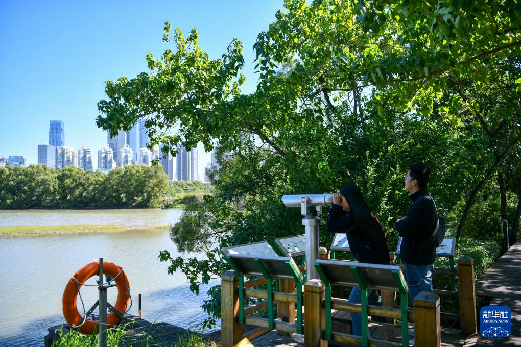 11月29日,游客在深圳福田紅樹林濕地觀察候鳥。