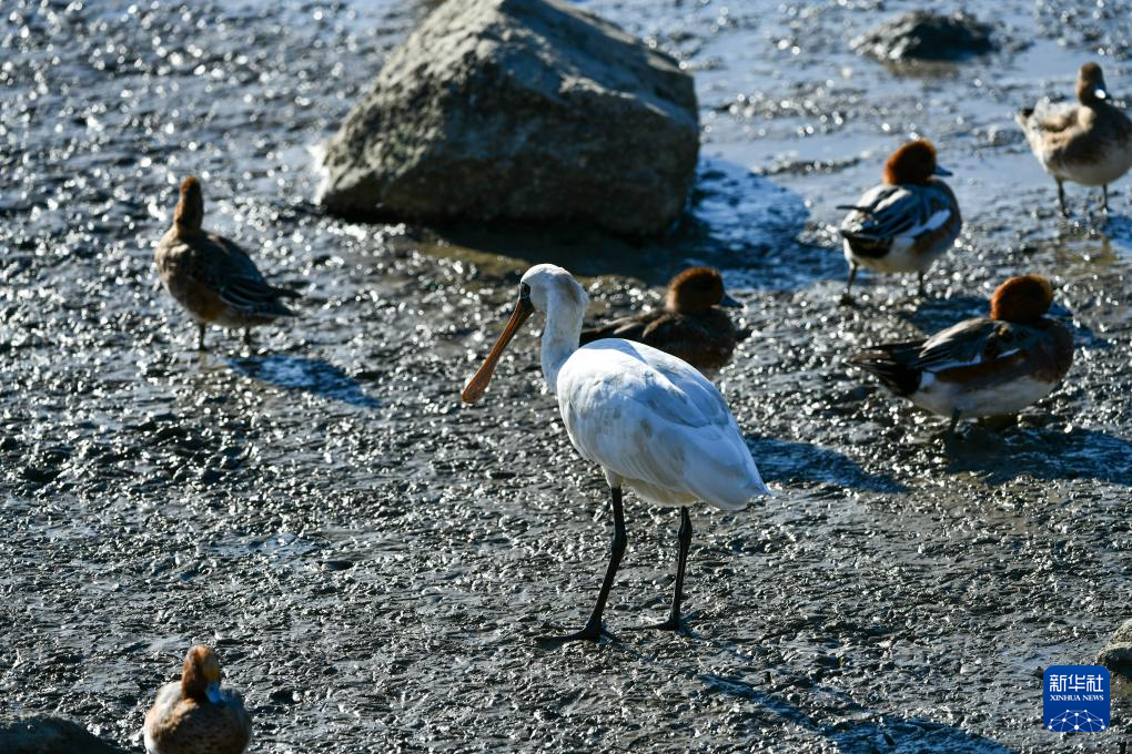 11月29日,在深圳紅樹林海濱生態(tài)公園,黑臉琵鷺等候鳥在覓食休息。