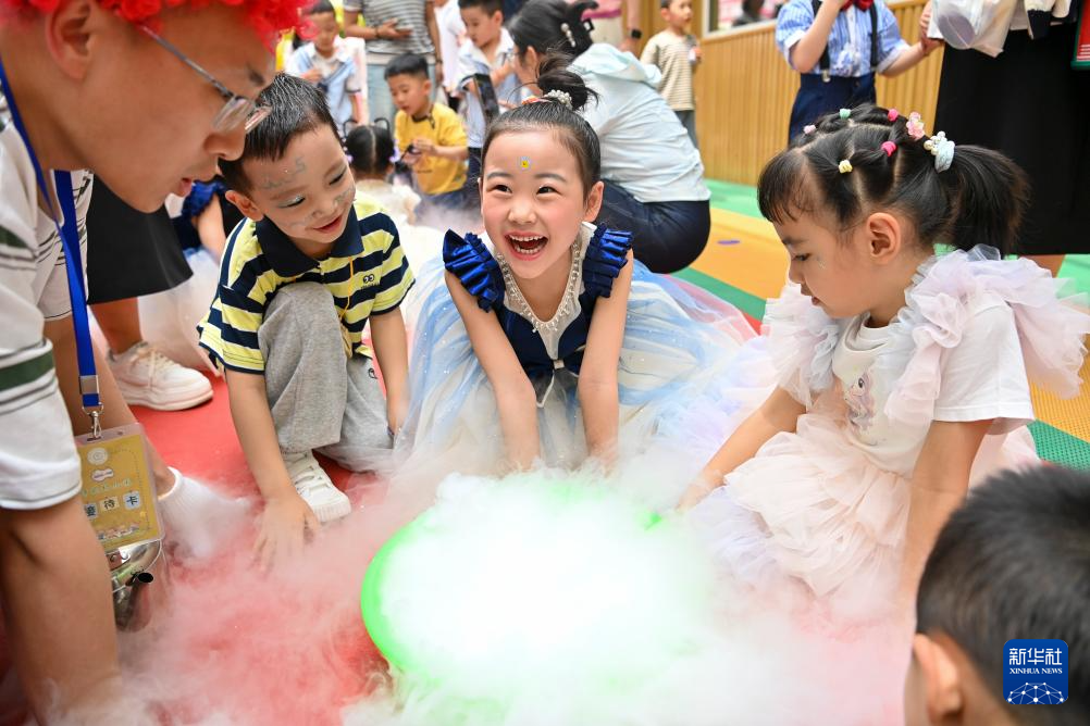 5月30日,山西省太原市迎澤區(qū)師苑幼兒園的小朋友在慶祝“六一”主題活動中觀看干冰實驗。