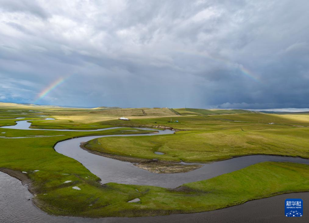 9月14日在內(nèi)蒙古呼倫貝爾市陳巴爾虎旗拍攝的彩虹下的莫爾格勒河(無人機照片)。