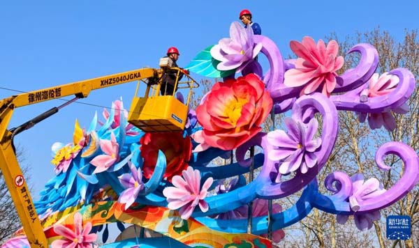 2月2日,在洛陽隋唐遺址植物園,工作人員在安裝花燈。