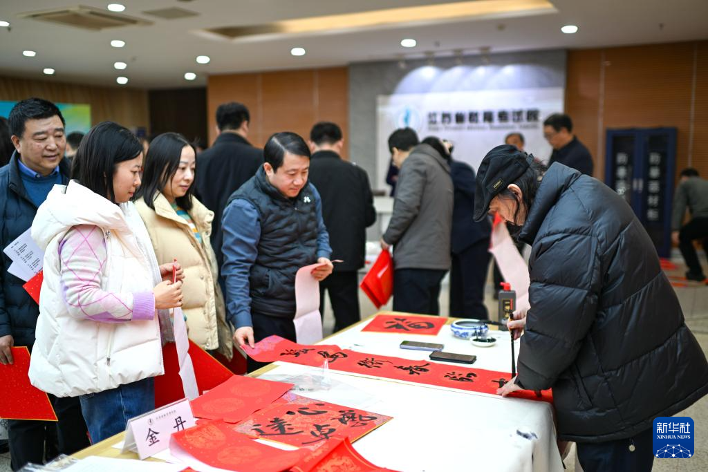 2月3日,南京藝術(shù)學(xué)院的書法教師為江蘇省教育考試院干部職工書寫春聯(lián)。