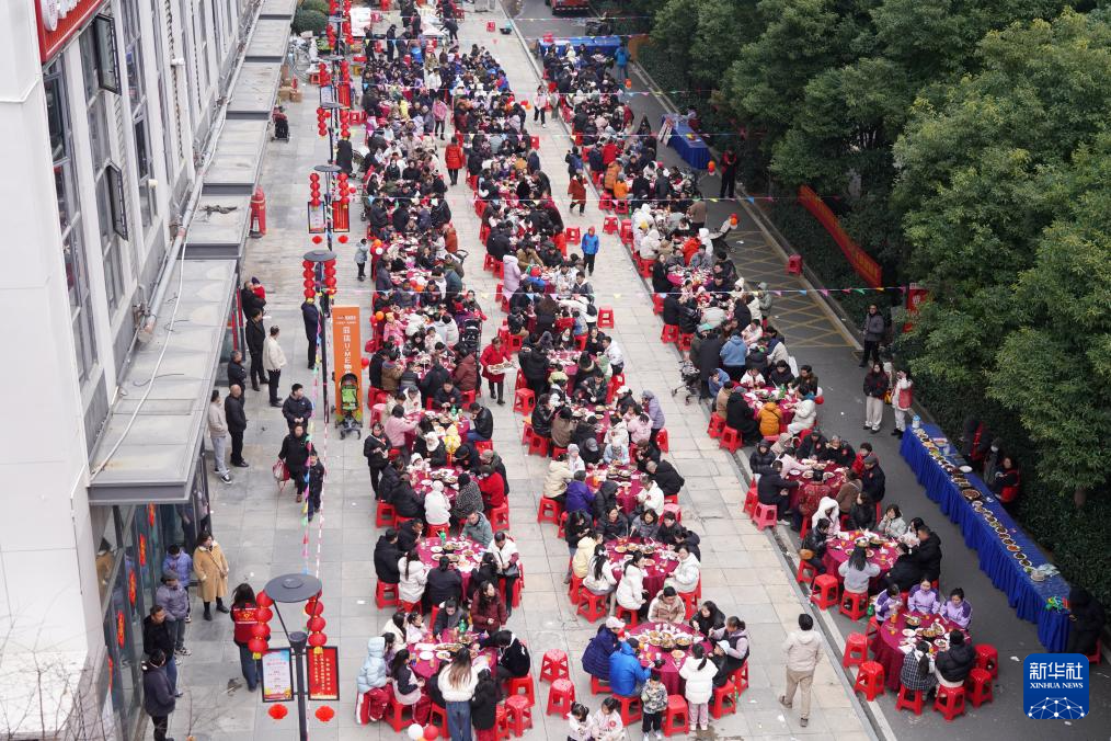 2月3日,湖北省武漢市經(jīng)濟(jì)技術(shù)開發(fā)區(qū)沌口街道永濟(jì)社區(qū)居民品嘗百家宴。