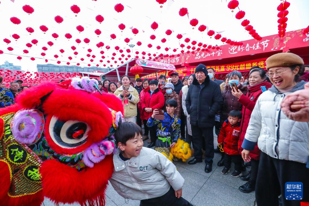 2月3日,在河南省信陽市光山縣司馬光廣場(chǎng)年貨市場(chǎng),市民與舞獅表演藝人互動(dòng)。