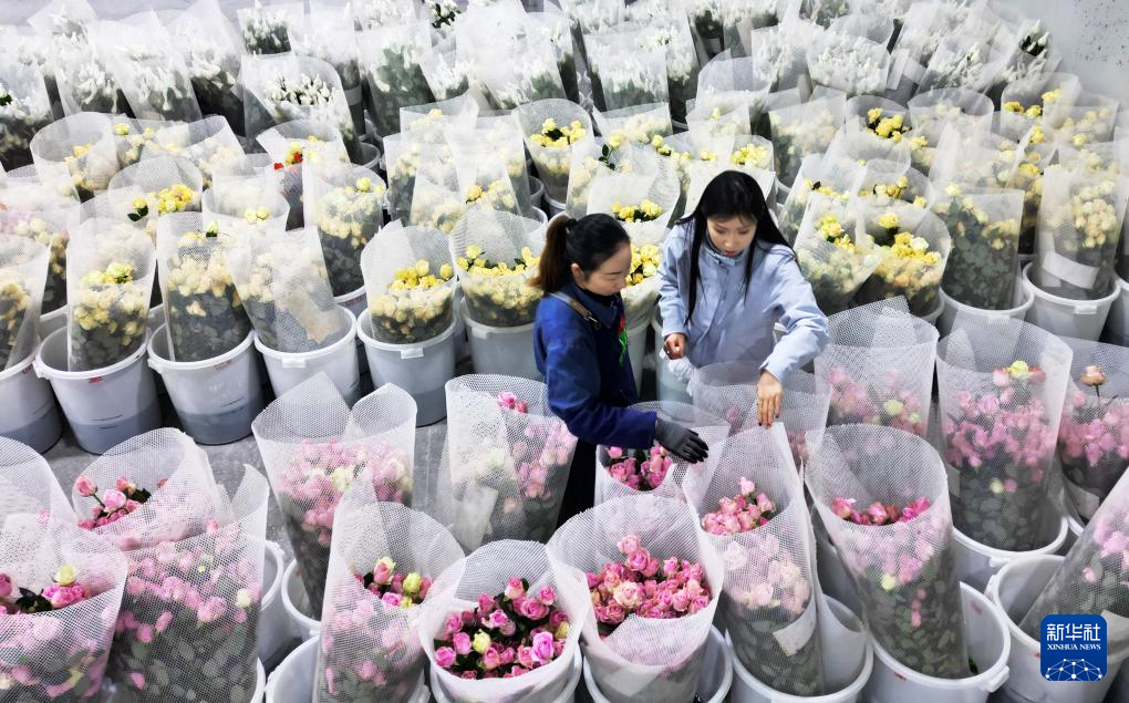2月1日,在甘肅省臨夏市枹罕鎮(zhèn)的億農(nóng)國際鮮花港保鮮冷藏室內(nèi),工人在整理鮮花,供應(yīng)節(jié)日市場(chǎng)。